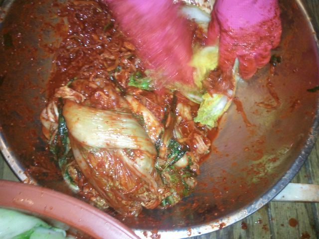 그래도 뭐 ....노랑 꼬갱이 몇 포기 남겨두고 오징어와 생굴 듬북 넣고 버무린.