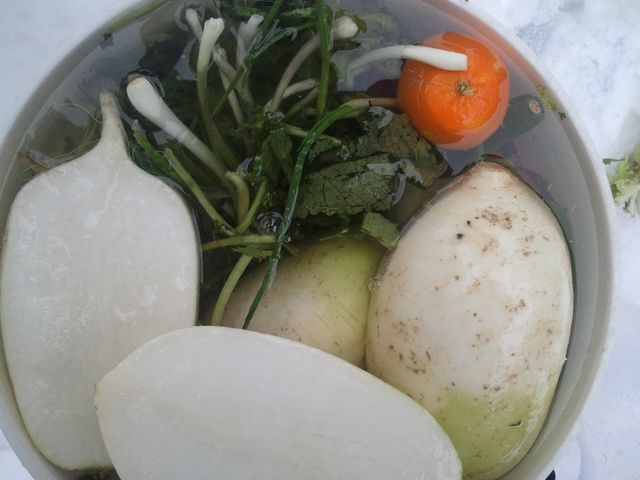보드레한 갓 칼질없이 뉘이고 속물들라고 반만 잘라 퐁당 귤!
