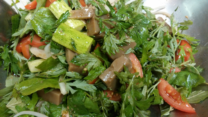 겨우살이 효소와 양파 효소를 그리고 천연 효소 식초로 버무린 도토리 묵에 요즘 한창 먹기 좋게 자란 쑥을 넣기로 정하고.