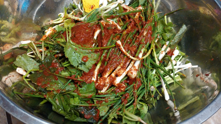 뒷마당에서 쑥쑥 뽑아온 쪽파에 청갓을 넣고 .....조물조물했더니