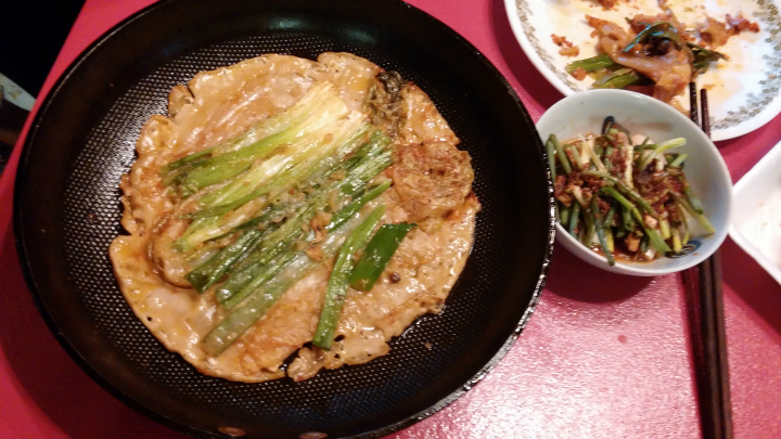 묵은 지 윗부분만 숭덩 썰어 두 잎 펼치고 뒤란에서 뽑아 온 쪽파를 손으로 뚝뚝 잘라 넣고