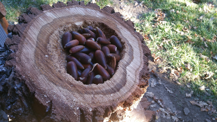 요리조리 틈마다 단단한 도토리를 촘촘히도 박아 놓았구먼.